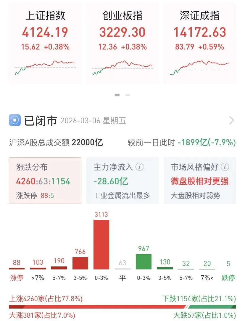 • 三大指数低开高走、集体收涨,深市强于沪市,个股普涨(超4200只上涨)。