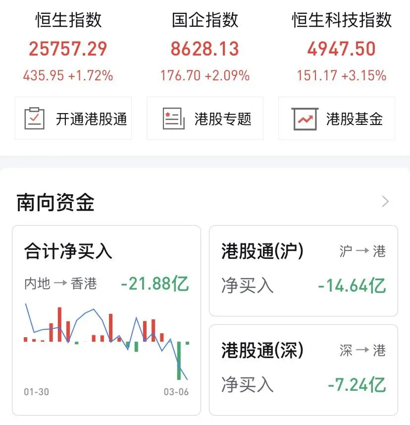 • 恒生指数:收 25757.29点,+1.72%(+435.95点);成交 2927.66亿港元