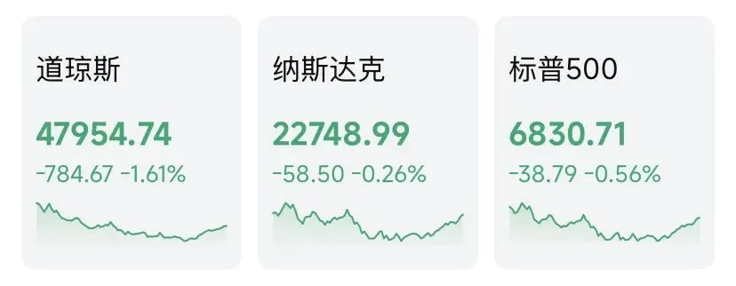 • 道琼斯:47,954.74,-1.61%(-784.67点);盘中最深跌超1100点