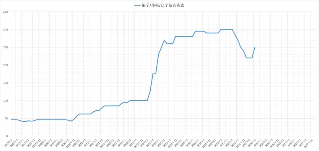 辽宁抚顺新宾产地细辛年后走货顺畅,价格略微回升,产地货源不多,中等统货个子价格为 240一260元每公斤,好货280元每公斤,全检饮片段435元每公斤左右,精品段儿525元每公斤左右,细辛芦头统货8-15元每公斤,细辛沫净货50-60元每公斤,今年含量达标货较少,后市持续关注上涨行情。