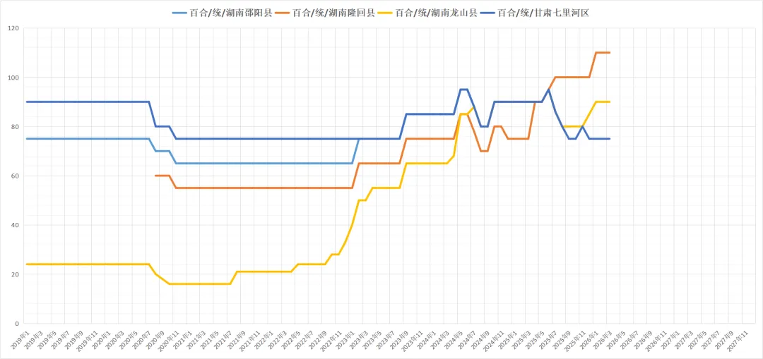 湖南产地龙牙百合年后走货平稳,产地货源不多, 价格稳定运行,关注人气较高,精选特级价格为135-145元每公斤,精选二级价格为130-135元每公斤,精选三级价格为118-130元每公斤,中三王115-120元每公斤,小三王95-105元每公斤,后市持续关注。
