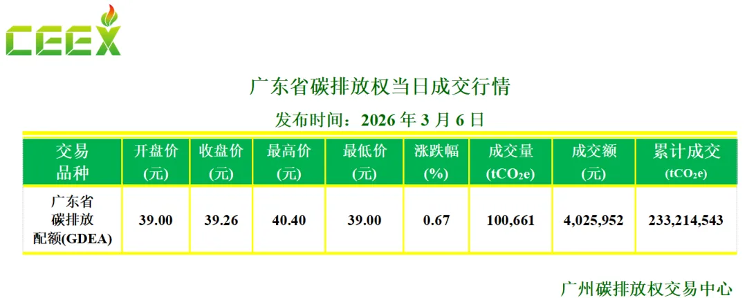 3月6日,广东碳市场成交配额100,661吨(含协议转让100,000吨),成交金额4,025,952元,开盘价39.00元/吨,收盘价39.26元/吨,较前一交易日上涨0.67%。