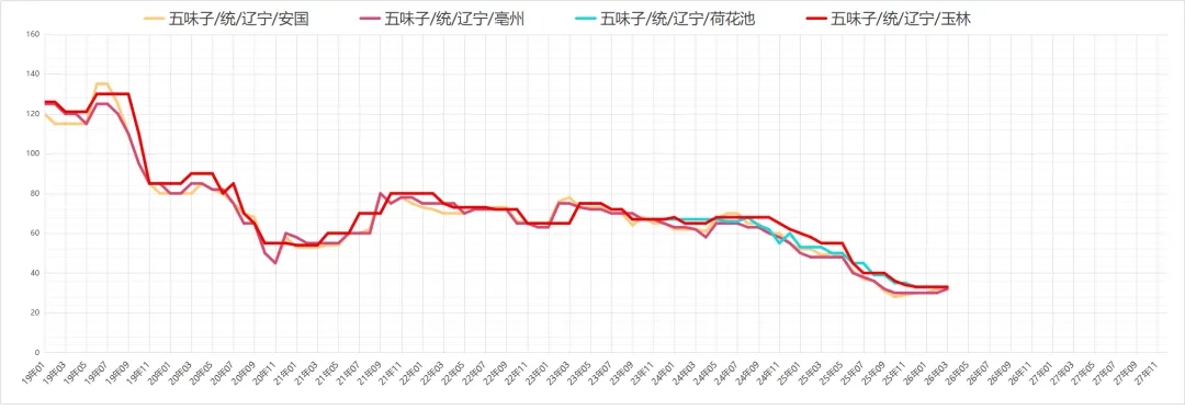 五味子价稳,近期商家关注力度一般,货源处于正常购销状态,行情与前期保持平稳,现市场五味子一般统货报价在31元上下,色选货报价在33-34元之间。