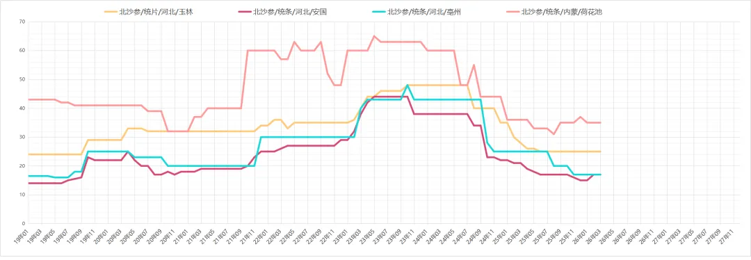 北沙参价格无明显波动,近期市场寻货商家多以询价为主,货源走销一般,购货商家多逢低购进,价格无明显波动,现河北统个货价格在16-18元。
