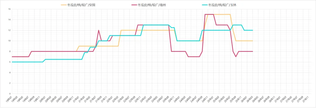 冬瓜皮年后行情平稳,近日市场商家多按需购进,市场可供货源量较丰,行情年前年后保持平稳,现色青晒货价格在12元左右,炕货价格在17元上下。