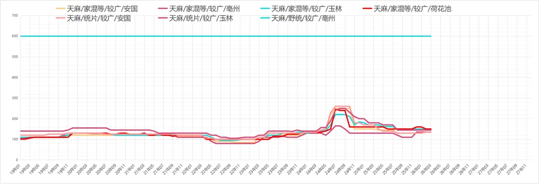 天麻行情走疲,近期商家的购进意愿不强,市场货源多是小批量成交为主,商家关注度下降,行情走疲,现统片价格在140-145元左右。