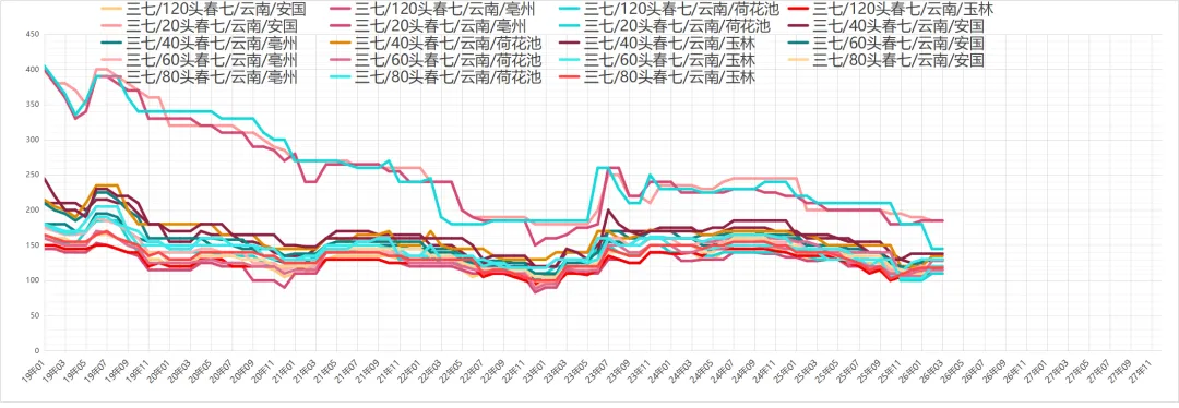 三七行情没有大的波动,市场货源小批量走动较好,经营商家手中货源有量,出售积极,行情没有大的波动,现120头的价格在115元左右,80头120元,60头125-128元。