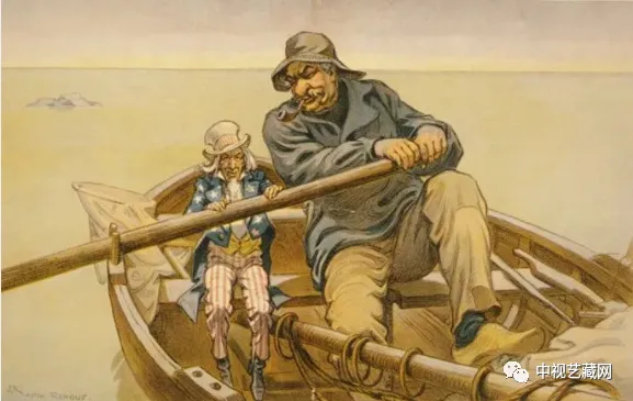 说J. P. 摩根是含着金钥匙出生的,这话一点也不为过。但出身对于J. P. 摩根意味着更严苛的教育和期待。他从一出生就被有意训练,以待日后掌管家族的银行帝国,一步步按照父亲的计划接受一系列家族继承人的培训:在波士顿接受基础教育,进入以数学专业著称的波士顿高中。毕业之后被父亲送往瑞士学习法语,能流利使用法语之后又被送往德国哥廷根大学学习德语和艺术史直到获得学位。1862年夏,美国南北战争处于胶着状态。一次友人到访,提到北军伤亡惨重的局势,无意中的闲聊让J. P. 摩根突然意识到这个时候也许正是购买黄金的好时机。他迅速联合家族在伦敦的银行,在华尔街黑市上秘密购买约500万美元的黄金,再将已购进的一半黄金汇往伦敦。与此同时,北军新近连续战败的消息得到证实,金价应声而涨。这样一来,J. P. 摩根不仅让自己的商行,也使远在伦敦的家族银行在这笔黄金买卖中赚了大钱。随着战争的推进,联邦政府出现了严重的财政危机,不得不硬着头皮开始发行4亿美元公债。此时的J. P. 摩根已是华尔街上崭露头角的年轻金融家,联邦政府希望他能部分承担国债的发行。利用家族的势力和自身的影响力,J. P. 摩根在美国新闻界不断发表对时局的评论,也组织和策划了许多演讲。一方面他谈爱国主义,另一方面他分析时局、推理经济发展的趋势,认为购买国债是一件有益于国家和个人的好事。J. P. 摩根不仅成功地为联邦政府发行了2亿美元的公债,从中稳赚了一笔巨额发行费,同时也成了民众心中有担当的爱国商人和民族英雄。1911年,美国Puck杂志刊登了一幅模仿法国艺术家Émile Renouf作品(1881)的政治漫画《援助之手》,原作中小女孩和老爷爷的形象分别被改为山姆大叔(美国)和J. P. 摩根