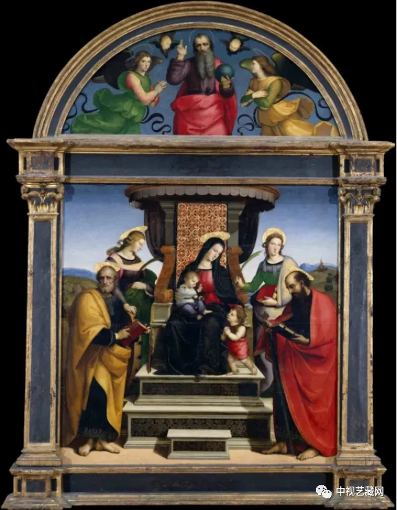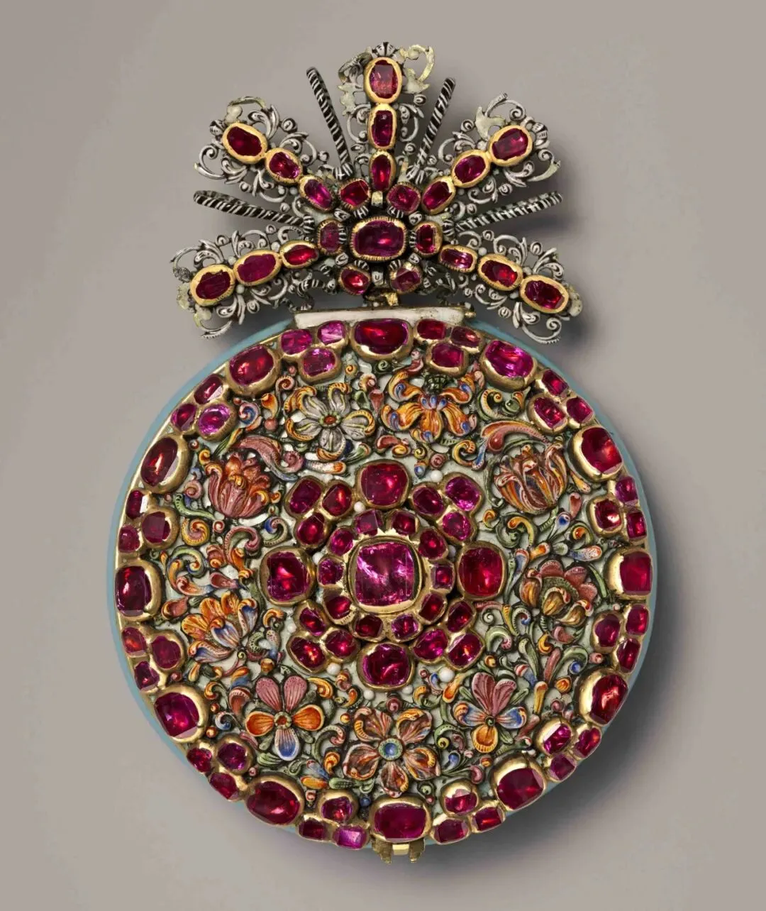 拉斐尔《圣母、圣子和圣徒》,约1504,摩根家族1916年赠予大都会艺术博物馆德国制表师尼古拉·鲁根达斯(Nicolaus Rugendas the Younger)制作的嵌珐琅、红宝石怀表,约 1670,摩根家族1917年赠予大都会艺术博物馆