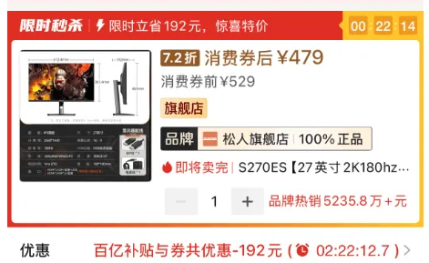 什么1080P啊,加一百就能换2K。把那破1080P扔了。第一款来自于松人的S270ES,这是一款标准的“小金刚显示器”,使用了IPS面板,拥有2K分辨率,180Hz刷新率,并且还支持壁挂(100*100mm规格)。最重要的是价格,记得去年这种参数的显示器还是要600元左右的,如今松人直接以百亿补贴首页8.5折券优惠后479的售价杀死了比赛。