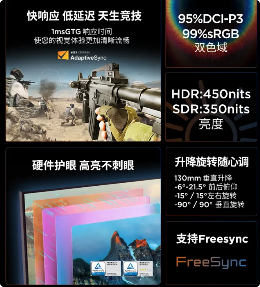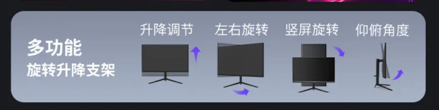 不过HPC的东西确实便宜啊,4K分辨率+160Hz刷新率的友达7.0面板【友达7.0面板性价比突出,4K高刷门槛低,色彩、响应速度均衡,适配多场景,但对比度、亮度上限一般。并且面板不一定是原生背光】,不过这东西的支架功能同样也是比较丰富,支持升降宣传的说: