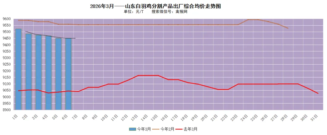 1、本月山东地区肉鸡分割冻品吨综合售价日运行走势如下图。据禽报网监测数据,2025年3月的月均吨综合售价日均值为9087元/T,2026年2月吨综合售价日均值9561元/T。