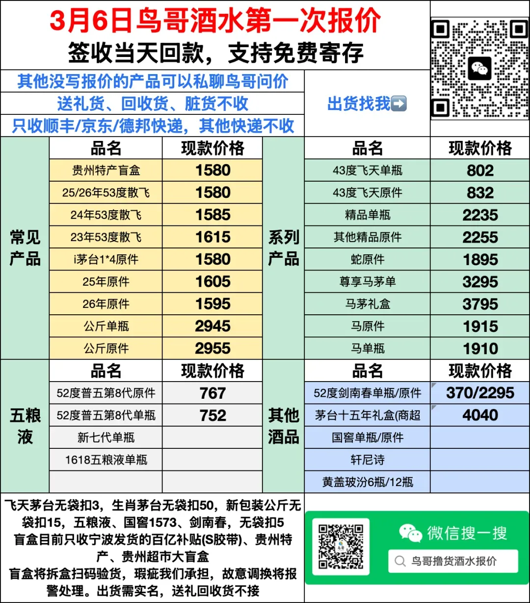 | 寄件地址:鸟哥收货小程序复制地址:回款收款:宁波地址签收后私信鸟哥报单:单号+明细到货默认出货,要寄存请提前通知!例如: SF6688548664364+ 飞天茅台盲盒双瓶*8+八代五粮液*6+出库/寄存 签收验货现款秒款 |