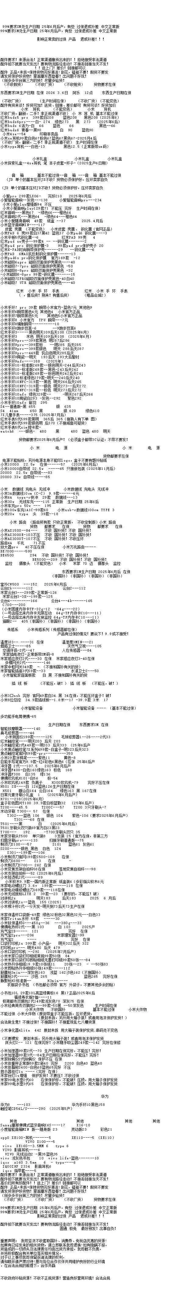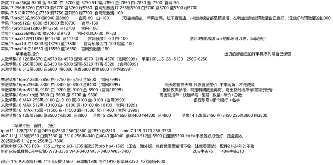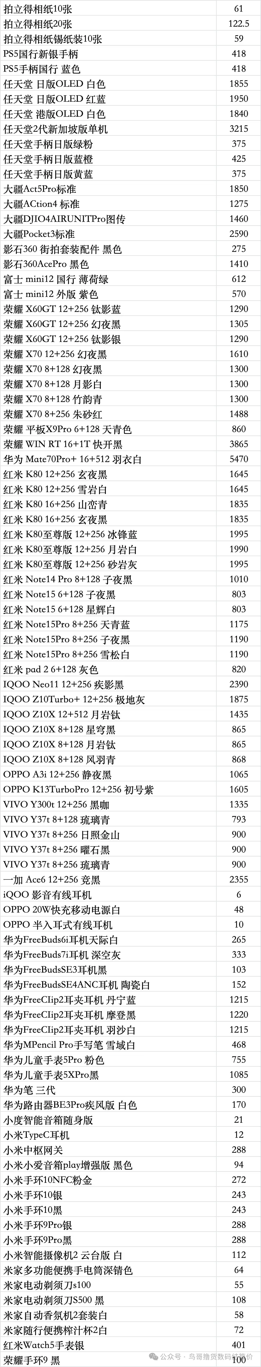 任天堂游戏机: 新款二代NS2港版标配机:3305 新款二代NS2港版马车机:3515,没游戏码:3240(注意下单要看有没有游戏码的 要不然就是便宜的) 新款二代NS2韩版马车机 没游戏码的:3170 新款二代NS2新加坡版 台版 单机:3210,就是没有游戏的 新款二代NS2韩版 欧版 美版 单机:3200,就是没有游戏的 新款二代NS2新加坡版同捆:3490 NS2港版宝可梦同捆:3570 OLED屏 日版白-25年生产日期1830 彩色-1950 OLED屏 港版白-1815 彩色-1915 OLED屏 国行白-1640 彩色-1640 OLED屏 朱紫港版-1930 日版-1930 OLED屏 喷射港版-1930 日版-1930 健身环国行-145 海外版-345 LITE日版 港版 蓝:1035,黑粉1035,绿黄1035 注意区分,这些就不是oled屏的 价格以下(续航版) NS续航国彩-1430 黑-1310,拆封-50 NS续航日彩-1540 黑-1470 长款-30 索尼PS5游戏机 (PS5都要留好纸箱带来,以免破坏品相) 2024新款:PS5 PRO日数:4820 2024新款:PS5 PRO港数:5220 2025新款:PS5 PRO国数:4820 2023新款ps5 日版光驱Slim:3310 2023新款ps5 日版数字Slim:2760 2023新款ps5 国行光驱Slim:老款:3040,新款3070 2023新款ps5 国行数字Slim:2470 2023新款ps5 港版光驱Slim:3320 2023新款ps5 港版数字Slim:2760 PS5国行手柄:白420,其他420,外版-20 只收跨境 PSP串流机:1345白,1345黑 PS5单光驱:615,外版575 ROG XBOX : OLED SteamDeck掌机掌上游戏机 512G 美:4030,日港:4030 OLED SteamDeck掌机掌上游戏机 1TB 美:4660,日港:4660 大疆3标准:,全能: 大疆Action4标准:,全能: 大疆ACT5 Pro标准:,全能: 大疆action5pro畅拍: 大疆AC6标准: 大疆AC6畅拍: 大疆NEO标配:,全能: 大疆OM7P:,om7: 大疆 mic1拖1:,1拖2: o4图传: 拍立得MINI12影像花室套装:,外版,一次成像礼盒装 拍立得SE国行:,白色: 拍立得相纸20张:122,10张:60.5 拍立得锡纸装10张:59 任天堂 手柄 NS左右手柄:370 NS2左右手柄:420 NS2 PRO 黑柄:420 PRO国黑柄:310,外版280只收跨境 PRO乱斗柄:330只收跨境 PRO王泪柄:330只收跨境 PRO喷射柄:330只收跨境 PRO异度柄:330只收跨境 大疆行清参考 大疆pk3标准2590 大疆pk3全能3290 大疆ac4标准1265 大疆ac5标准1860 大疆ac6标准2790 待更新 大疆配件:山姆三脚架:35 大疆配件:山姆256G:280 影石acepro一代1400 影石acepro2双电黑2270 影石aceproPro2 街拍黑 280 银285 华为手表目前行情参考 华为 Watch FiT4 黑 550 白 545 绿 555 紫 550 银 575 华为 Watch FIT4 pro 黑 1145 蓝 1095 绿 1185 华为 WATCH FIT 2 活力款 黑色 325 粉 325 华为 WATCH FIT 3 黑 435 灰 545 月光白 435 原野绿 455 粉 435 薄荷绿 445 蓝 435 珍珠白 495 Watch D2 黑 2875 白 2755 蓝 2755 Watch D2 药房版 2475 Watch buds 黑 1135 卡其色 1215 GT4 41m 白 795 黑 725 GT4 46m 黑 845 Watch 5 46m 黑 1820 紫 2175 棕 2265 蓝 1865 钛空银 2595 Watch 5 42m 黑 1685 白 1805 杏 2275 绿 1725 金 2365 非凡 2 黑 5045 蓝 6015 非凡手表 黑 3445 华为新款 WATCH GT5 系列 GT5 46 黑 1065 蓝 940 棕 910 灰 920 GT5 41 黑 925 蓝 895 白 910 青 860 棕 840 GT5pro 黑 1165 陶瓷 2105 钛钢色 1385 冰川白 1015 GT6 pro 黑 1800 棕 2075 钢 2500 GT6 46m 黑 1125 灰色 1290 绿色 1425 GT6 41m 黑 1025 棕色 1405 白色 1210 紫色 1035 蓝 1010 华为儿童手表系列 儿童 4pro 蓝 500 粉 505 儿童 5pro 蓝 760 粉 755 绿 755 紫 760 儿童 5X 蓝 725 粉 725 儿童 5Xpro 黑 1085 紫 1105 儿童 5 绿 360 紫 360 蓝 415 活力蓝 335 红 335 儿童 5 星耀 粉 410 蓝 425 荣耀,华为手环 荣耀手环 9 标准黑 98 蓝 108 紫 108 荣耀手环 9NFC 黑 120 蓝 120 紫 120 荣耀手环 10 标准黑 135 绿 135 灰 135 蓝 135 荣耀手环 10NFC 黑 155 灰 155 绿 155 蓝 150 华为手环系列 华为手环 8 标准黑 108 粉 108 华为手环 8NFC 黑 110 华为手环 9 黑 155 白 145 粉 143 黄 140 蓝 140 华为手环 9nfc 版 黑 165 白 152 粉 150 蓝 150 黄 150 华为手环 10 标准 黑 162 粉 162 华为手环 10 铝合金款 黑 168 白 170 蓝 170 紫 170 向新绿 165 原野绿 160 灰 165 华为手环 10NFC 黑 191 白 197 蓝 195 紫 200 绿 193 B7 黑 690 灰 685 华为耳机系列 华为 Free Arc 绿 400 灰 415 黑 415 白 390 华为 FreeBuds 7i 白 338 灰 332 粉 338 华为 freebuds6i 耳机 白 263 黑 270 紫 260 华为耳机 Free clip2 黑 1220 白 1215 蓝 1215 金 1220 紫 1220 华为耳机 Free clip 黑色 840 暖星云 925 紫 830 玫瑰金 830 华为耳机 FreeBuds 5i 黑 208 白 217 蓝 217 华为 FreeBuds se2 耳机 白 71 蓝 73 黑 73 紫 73 华为 FreeBuds se3 黑 101 金 100 白 98 华为 FreeBuds Se4 白 149 黑 149 FreeBuds 6 白 515 黑 520 紫 520 金 515 FreeBuds 4e 2024 款 白 290 银 290 FreeBuds pro5 白 1075 银 1105 金 1105 蓝 1115 FreeBuds pro4 黑 715 绿 695 白 730 华为 CD56 pro 笔 465 华为 CD57 黑 265 白 275 华为 CD54S 三代笔 295 华为 三代笔充电器 78 Wifi5 黑 175 白 175 青 173 WiFi3 pro 265 AX3 121 AX6 new 243 AX3 pro new 197 AX3 pro WiFi7 187 BE3pro 千兆版 180 BE3pro 疾风版 167 BE7pro 405 AX2pro 103 荣耀手表 荣耀手表 4pro 黑 725 棕 825 绿 795 荣耀手表 5pro 蓝牙版黑 1085 灰 1085 荣耀手表 5pro 插卡版黑 1185 灰 1185 荣耀手表 5Ultra 黑 1215 棕 1475 钛金属 1895 荣耀手表 5 黑 535 |