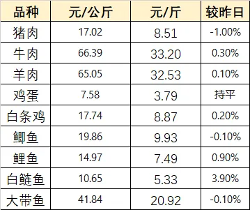 肉类产品中,牛肉、羊肉和白条鸡均有轻微上涨,鸡蛋价格保持稳定。