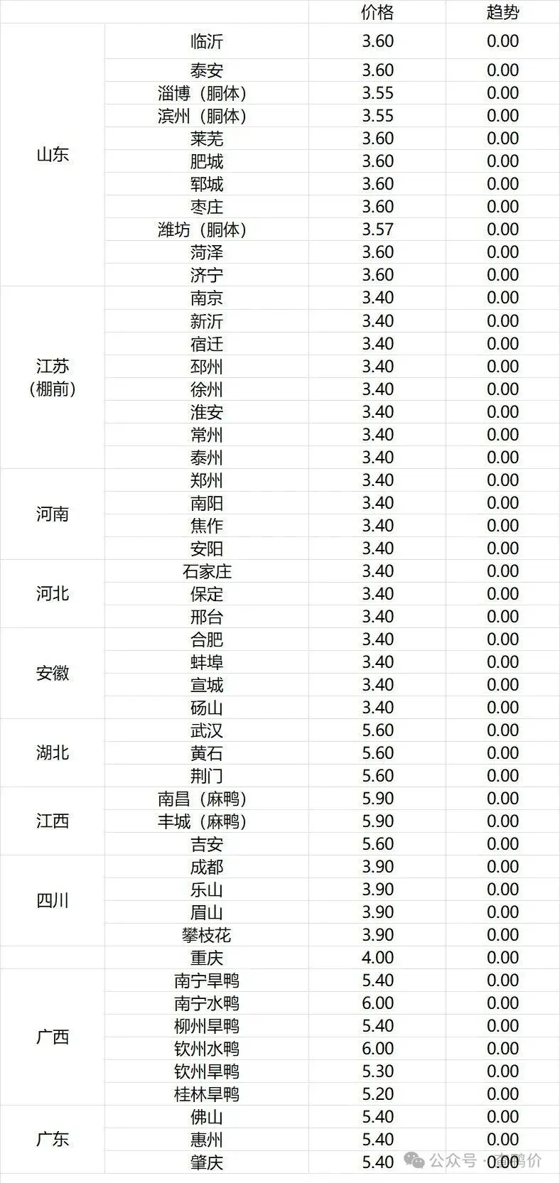 微评:鸭苗报价稳定。(注:南方只报当天价格)市场情绪一般,交投平淡。根据产品、养殖成本及鸭苗现状分析,预计近期鸭苗价格呈震荡微调趋势。种蛋报价落1毛。温馨提示:该价格为主流厂家报价,实际销售价格以成交价格为准,价格仅供参考。