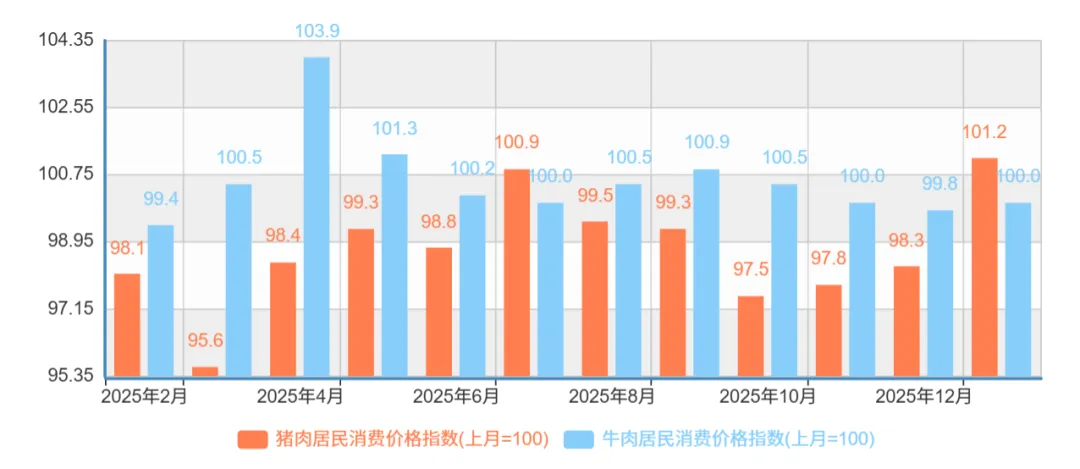 近12个月牛肉与猪肉居民消费价格指数(上月=100)