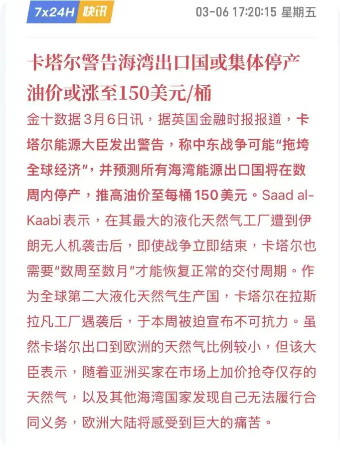 熟悉国际能源和贸易的人都知道,霍尔木兹海峡是全球能源运输的“咽喉”,日均承担着全球25%至30%的海运石油贸易量,海湾地区主要产油国90%以上的原油外运都要经过这里。今年以来,中东局势持续升级,伊朗宣布禁止船只通过该海峡,原油运输已经陷入“实质性停滞”,国际油价大幅飙升——3月2日当天,英国布伦特原油开盘大涨13%至每桶82美元,美国WTI原油涨超10%,市场预测如果封锁持续,油价可能突破每桶100美元。