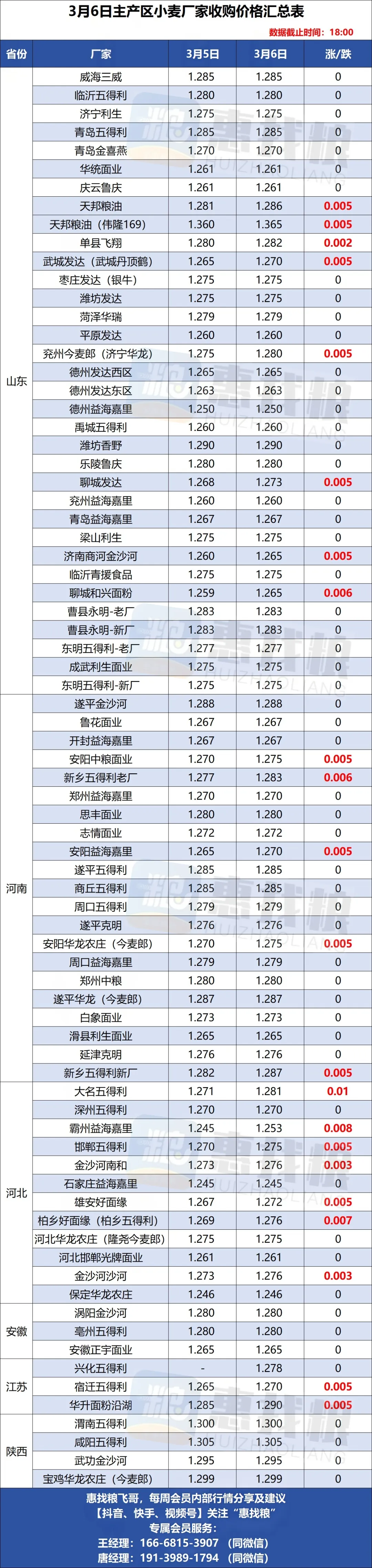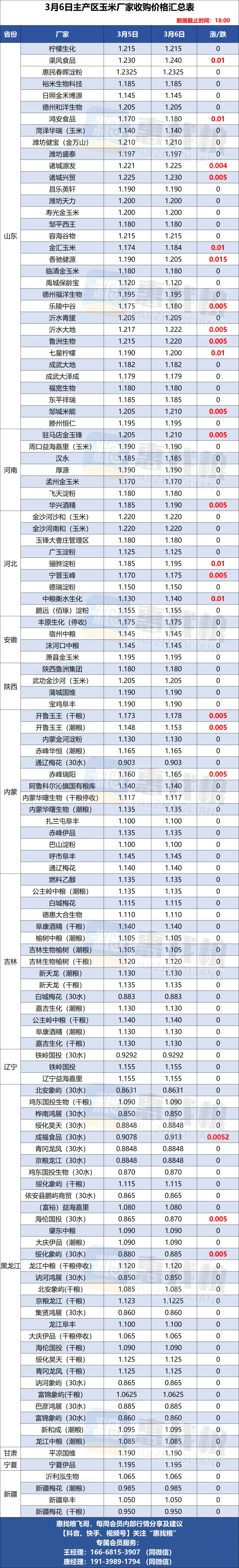3月6日全国小麦/玉米厂家涨落行情