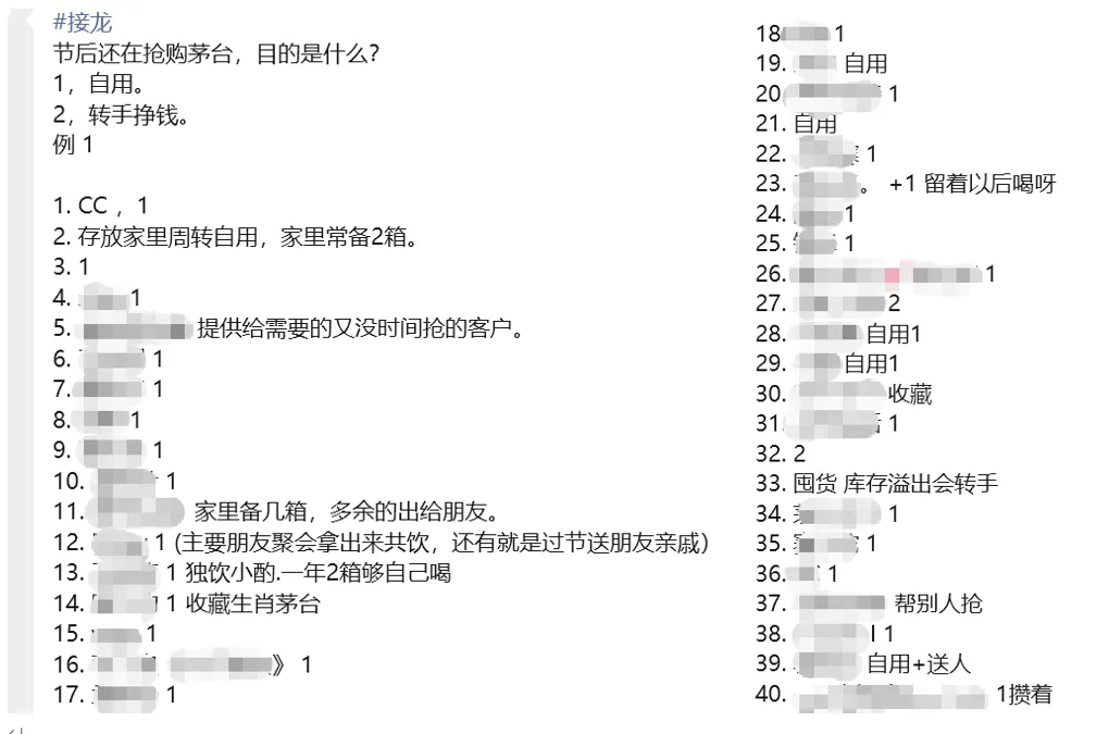 于是,我们在微信群发起了一个接龙:节后还在抢购茅台的朋友,目的是什么?