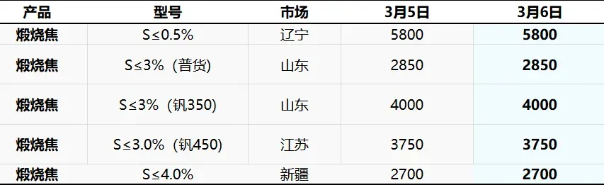 今日,国内煅烧焦价格持稳为主,均价收于3515元/吨,环比上一工作日持平。