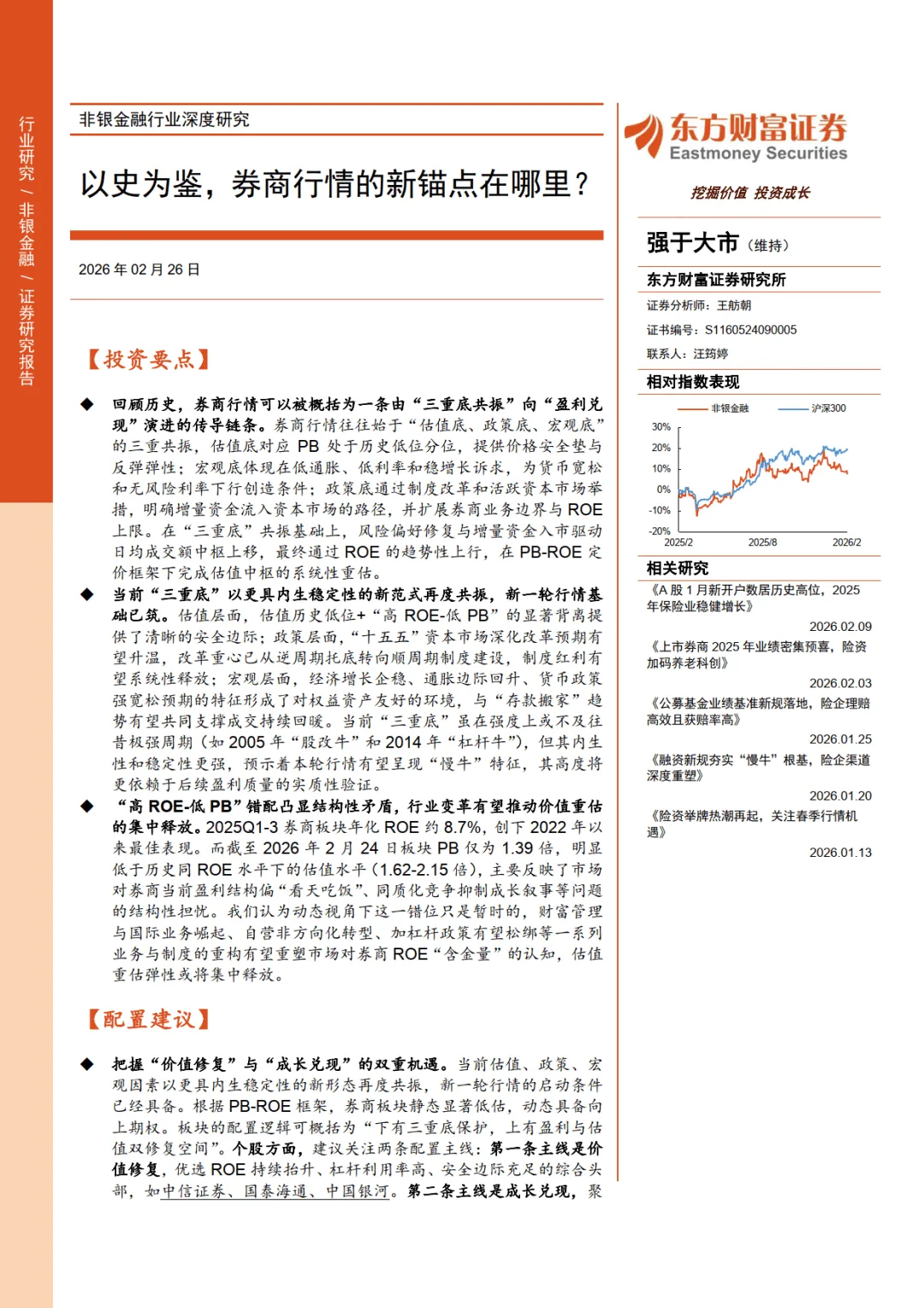 报告为 2026 年 2 月发布的非银金融行业券商板块深度研究,以历史复盘为基础,剖析当前券商板块 “三重底” 共振新范式,指出 “高 ROE - 低 PB” 错配的核心矛盾,并给出价值修复与成长兑现的双主线配置建议。————
