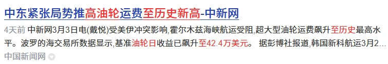 受此影响,全球主要货代企业数据显示,霍尔木兹海峡的集装箱船通行量已降至为零。中远海运已暂停全球至阿联酋、卡塔尔、伊拉克等波斯湾国家相关航线的订舱业务。航运市场出现剧烈波动:上海港至波斯湾航线运价单周上涨35.4%;油轮日租金攀升至42.4万美元,创下历史新高。