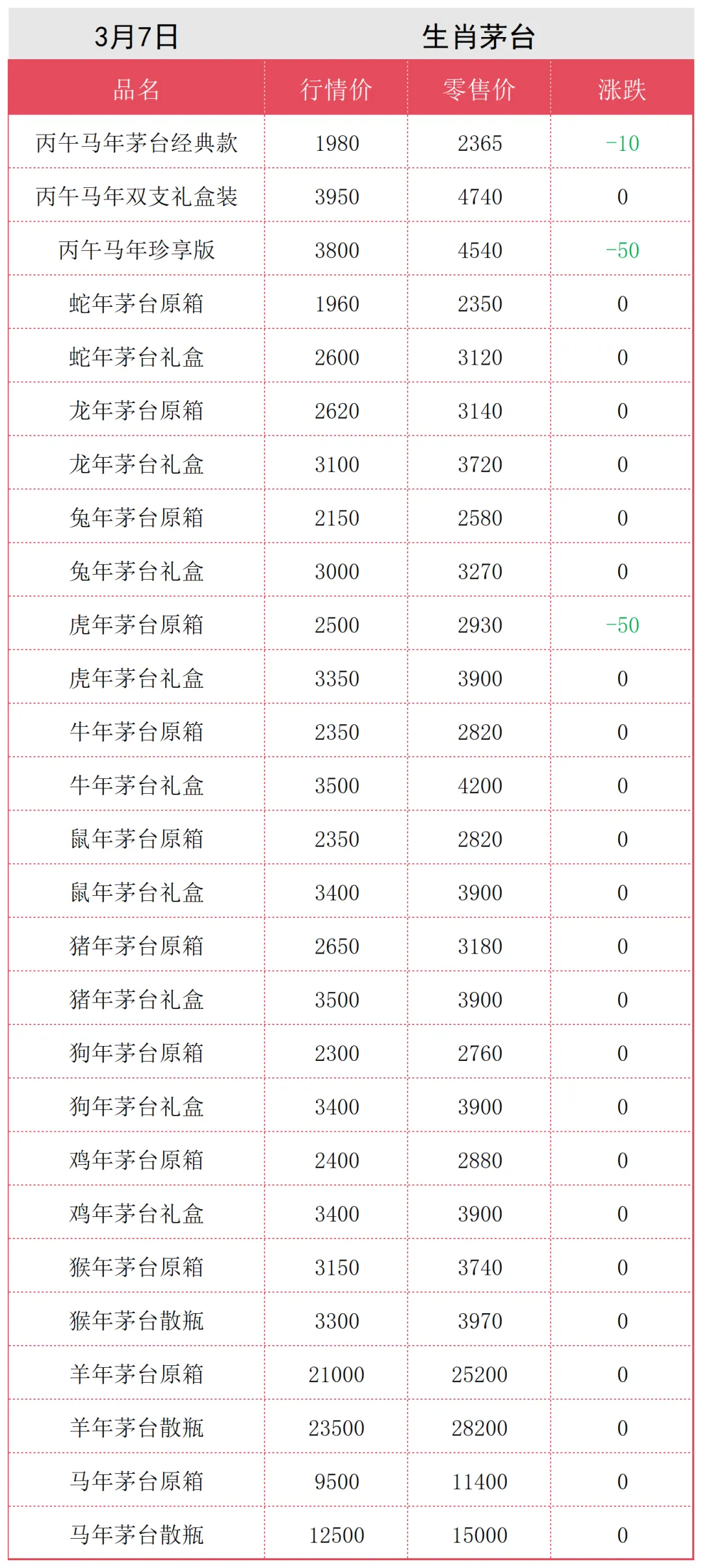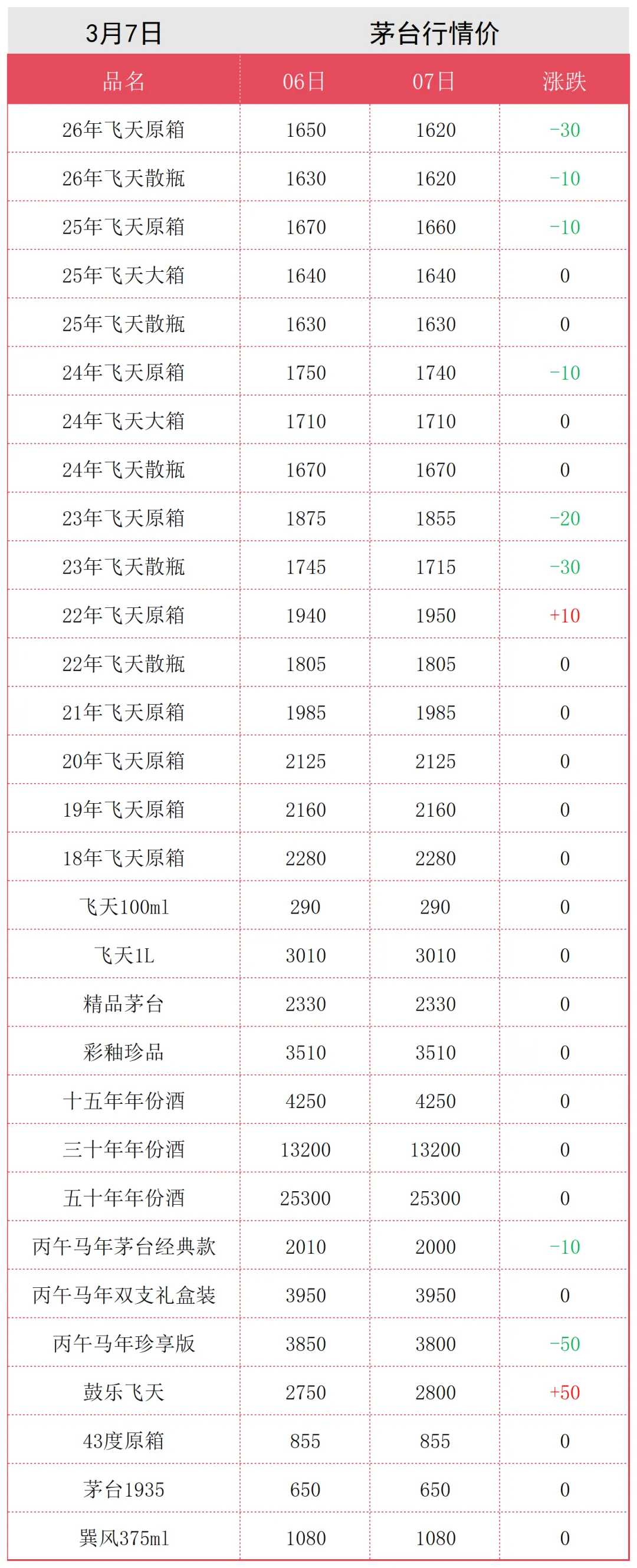 3月7日酒类今日行情 l 段永平:买茅台股票,就当存了个10年的定期存款