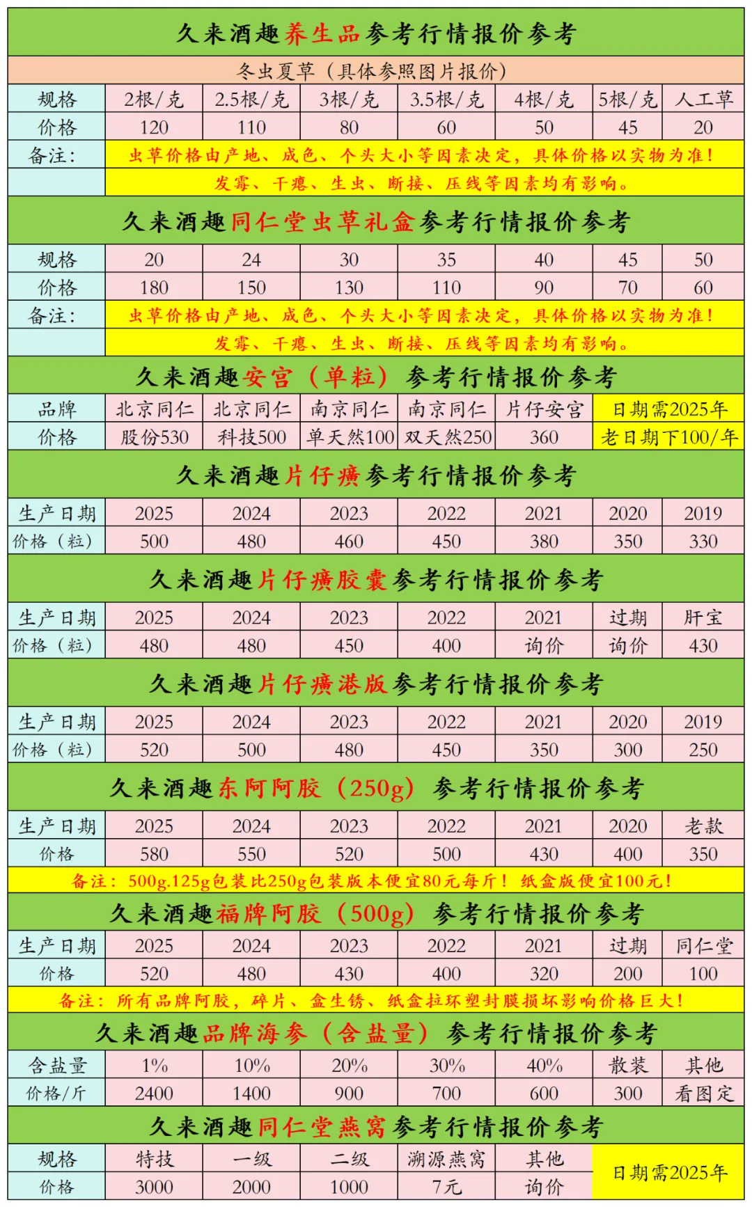 洋酒红酒包含品类:路易十三、奔富、拉菲、轩尼诗等!养生品涵盖虫草、燕窝、安宫等行情参考如有补充请及时联系我们: