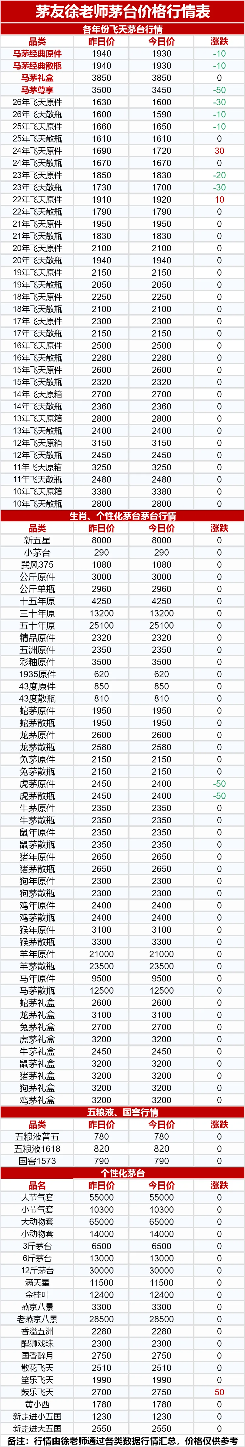 行情价:本公众号发布的价格是行情价格,是全国酒商调该品类茅台的价格,是零售价和回收价的基准价格。