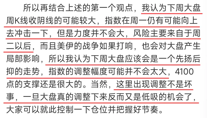 需要注意的是,我在周六发表周评的时候中东的消息还没有传来,所以周评中对于本周大盘有必要进行一次调整的观点主要是结合大盘本身的走势结构以及两会召开的时间点等因素来判断的,应该说本周大盘虽然受到了中东战事的局部干扰,但是整体的运行节奏并没有被破坏,最终指数还重新收复了4100点,整体的走势与周评的预期是完全一致的。