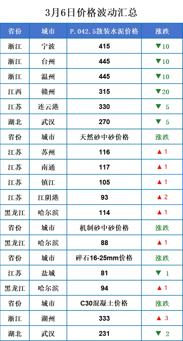 3月6日全国砂石行情以涨为主,主要涉及江苏研究天然砂。