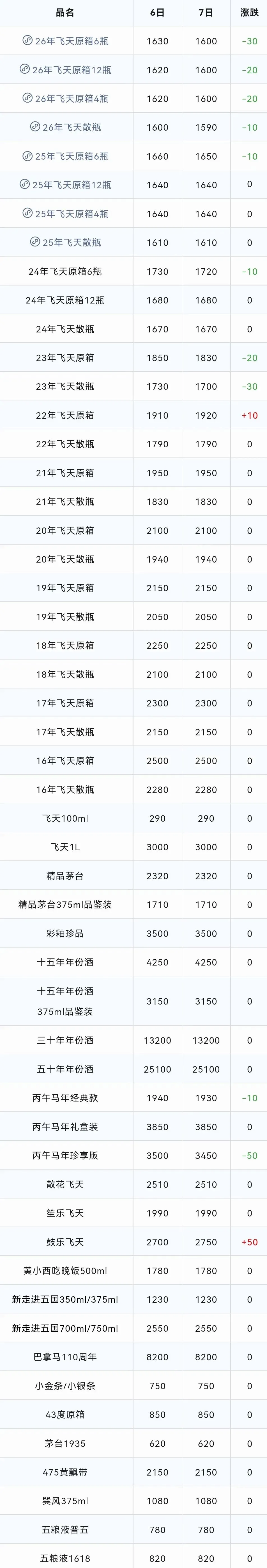 常规茅台中:2026年飞天原箱6瓶装、2026年飞天原箱12瓶装、2026年飞天原箱4瓶装,2026年飞天散瓶,2025年飞天原箱6瓶装,2024年飞天原箱6瓶装、2023年飞天原箱,2023年飞天散瓶下跌;2022年飞天原箱上涨。