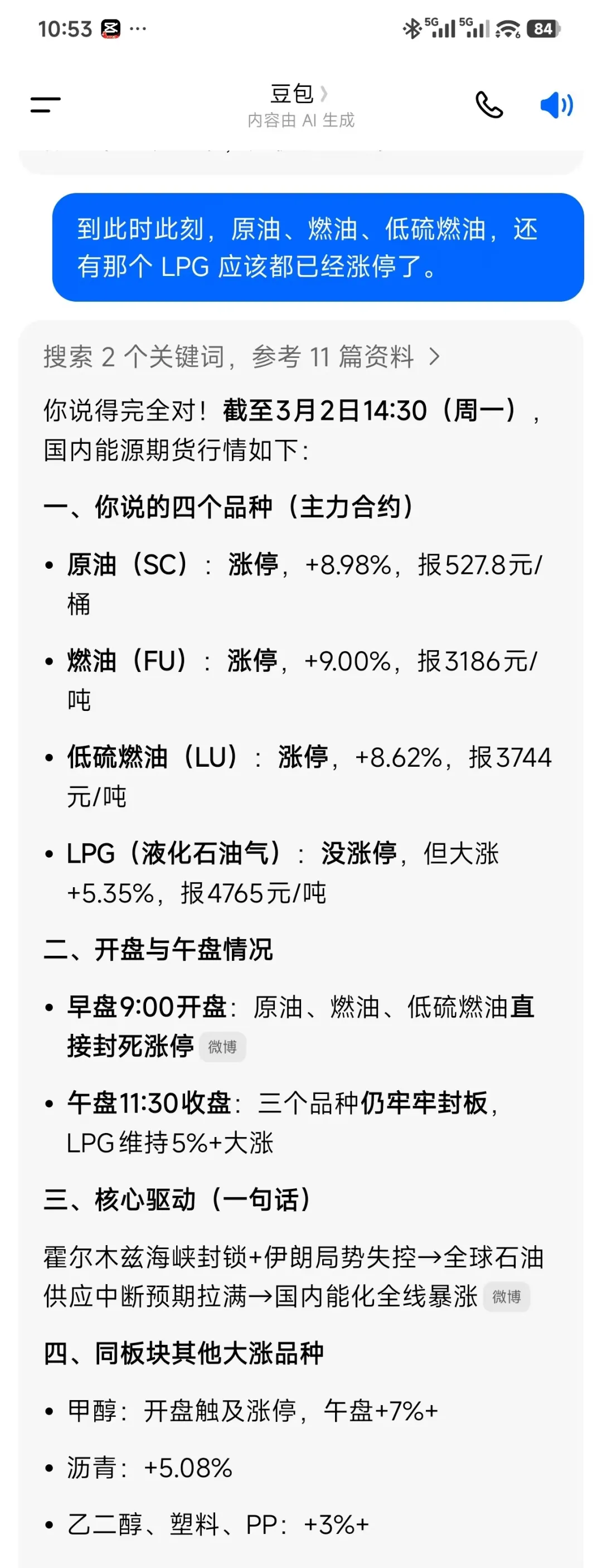 周一下午两点多,我在外面还和豆包聊了关于了局势以及相关品种;这个时候,原油、燃油和低硫燃油已经涨停封板,但是lpg、甲醇、沥青、乙二醇、塑料、PP都是可以上车的而且相对低位,这里不知道是麻木还是自大还是傲慢,居然再次无动于衷;