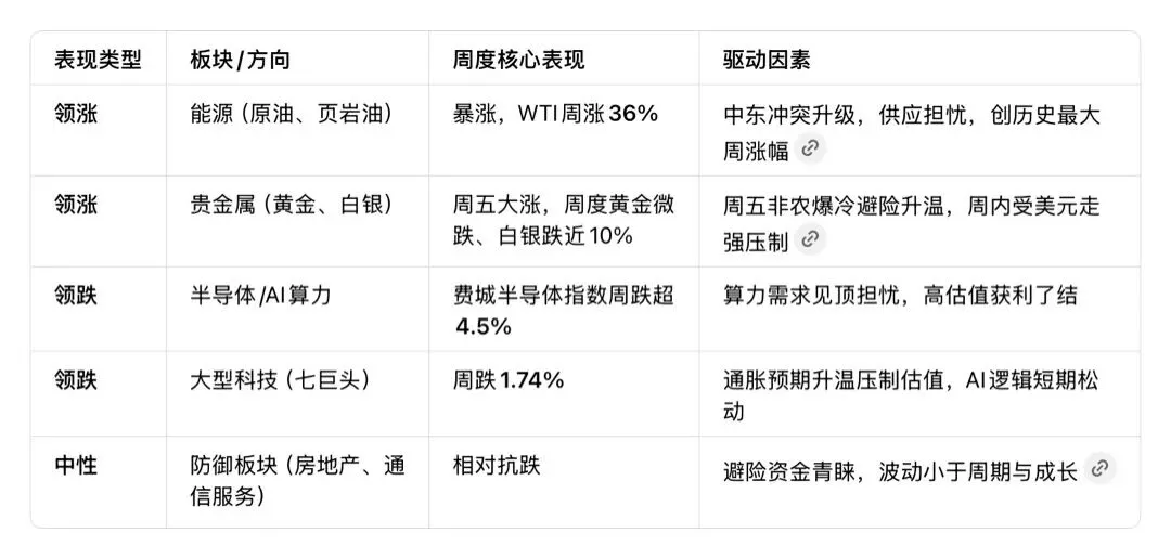 • 节奏特征:周初震荡,周三因地缘升级出现“V型”波动,周五受非农爆冷与油价暴涨拖累集体收跌,纳指相对抗跌(权重科技支撑),道指领跌(周期、金融拖累)。