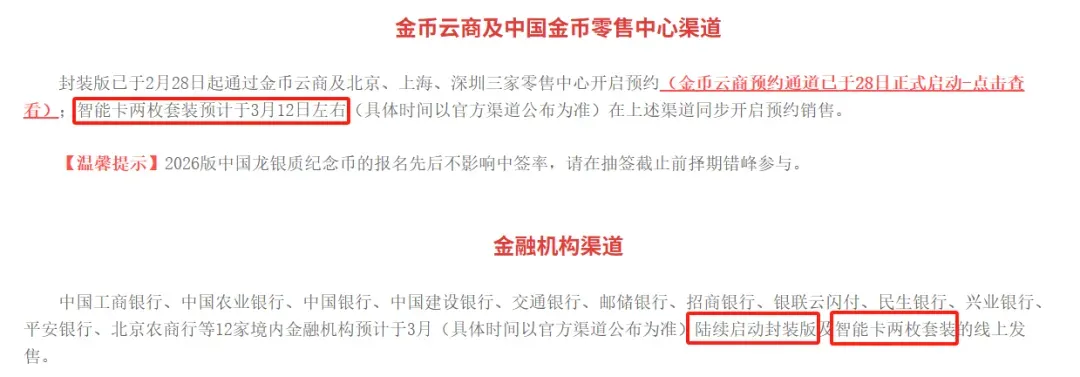 根据中国金币官方消息:3月12日左右,将开启2026版中国龙智能卡对币及封装的银行机构渠道的线上首发预约!