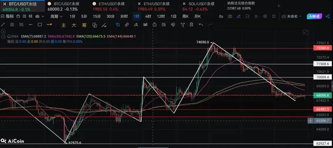 大家晚上好,我是新犽,最近更新较为低频,自上次更新后,给了做多建议以及止损点,嗯,市场比较激烈,最高涨到了73500一带。至少希望你们拿到了吃满了一笔多的部分