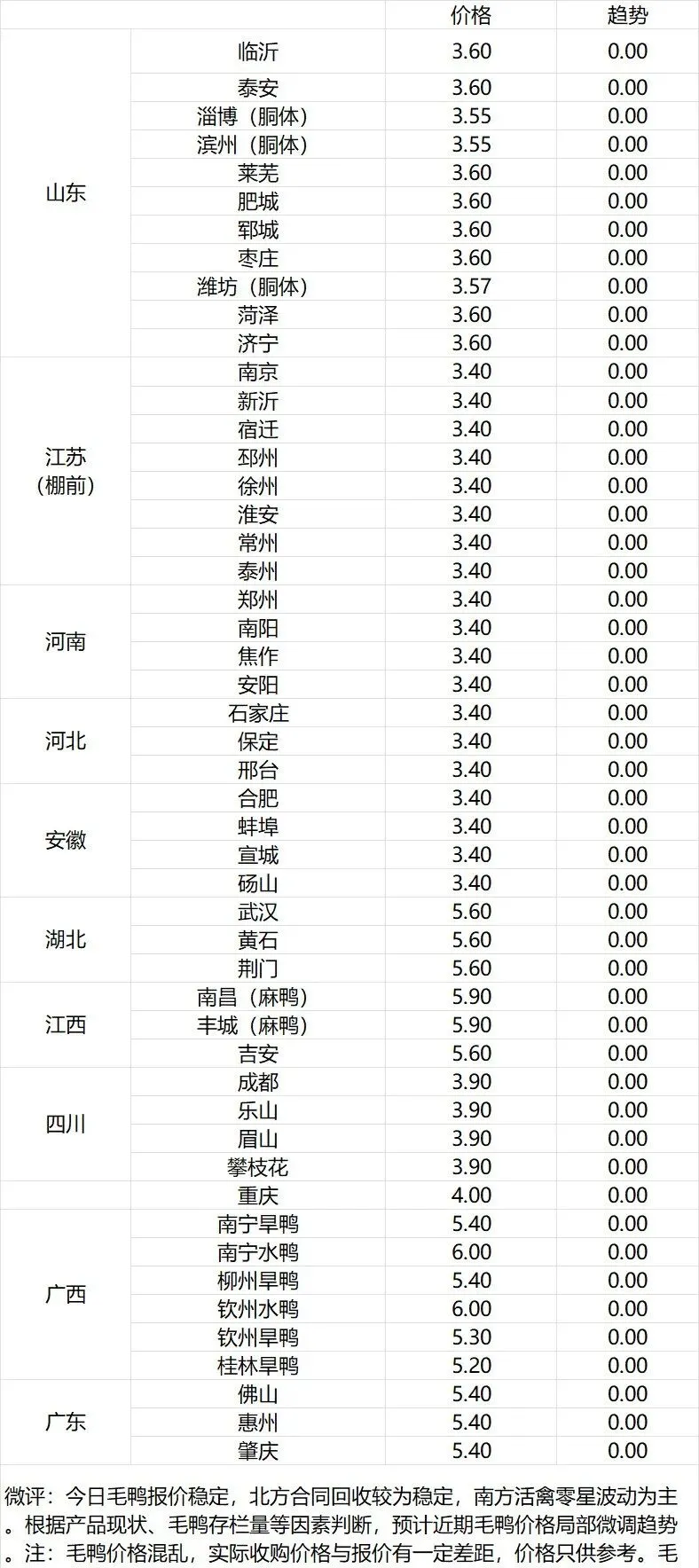 微评:鸭苗报价涨跌不一。(注:南方只报当天价格)市场情绪一般,交投平淡。根据产品、养殖成本及鸭苗现状分析,预计近期鸭苗价格呈震荡微调趋势。种蛋报价落1毛。温馨提示:该价格为主流厂家报价,实际销售价格以成交价格为准,价格仅供参考。