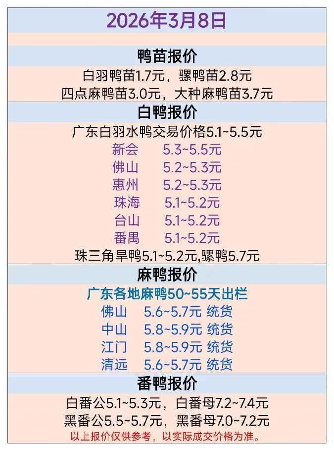 今日广东白羽水鸭价格上涨,报5.1~5.5元(7斤以上标准),旱鸭价格稳定,报5.1~5.2元;骡鸭价格稳定,报5.7元;麻鸭价格下跌,报5.6~5.9元;白番公鸭价格稳定,报5.1~5.3元;白番母鸭价格稳定,报7.2~7.4元;黑番公鸭价格稳定,报5.5~5.7元;黑番母鸭价格稳定,报7.0~7.2元。今日白鸭苗价格上涨,报1.7元;四点麻鸭苗价格稳定,报3.0元;大种麻鸭苗价格稳定,报3.7元;骡鸭苗价格上涨,报2.8元。广东大种白番公苗报4.6~4.9元, 大种白番母苗报5.6~5.3元;广东大花黑番公苗报4.1~4.6元, 大花黑番母苗报5.1~5.6元。