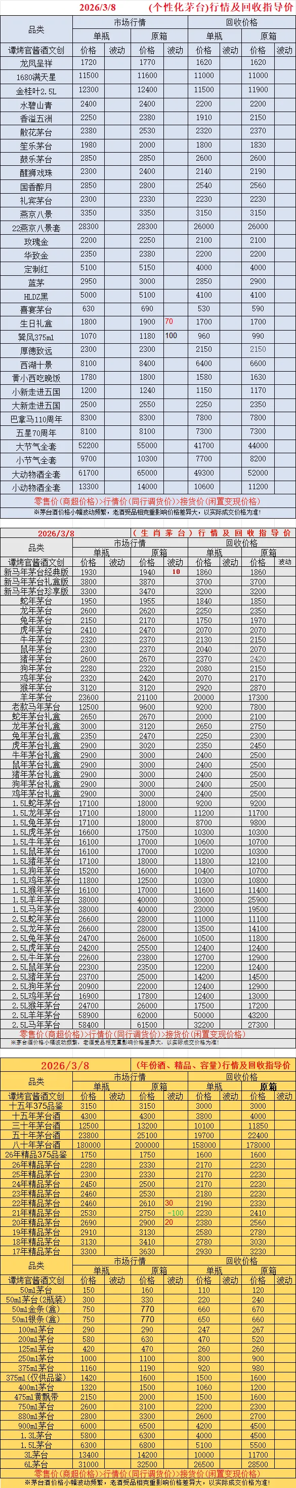 常规茅台中:2026年飞天原箱6瓶装、2026年飞天散瓶、2025年飞天原箱6瓶装、2025年飞天散瓶、2024年飞天原箱6瓶装下跌;精品茅台中:,22年,20年原箱精品上涨,21年原箱精品下跌。生肖茅台中:新马年经典上涨,蛇年生肖原箱下跌。 个性化茅台中:香溢五洲上涨