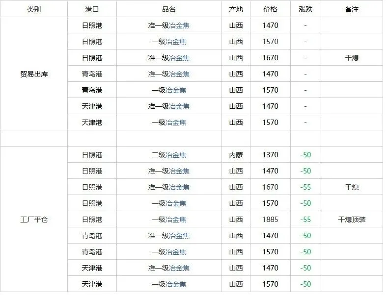 一级干熄焦(A≤12.5,S≤0.7,CSR≥65,MT≤0),报1920元/吨;(顶装焦)