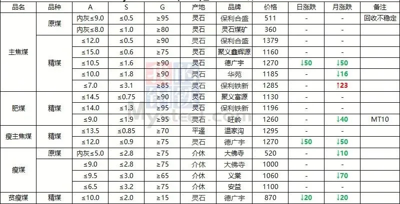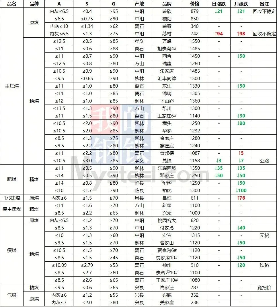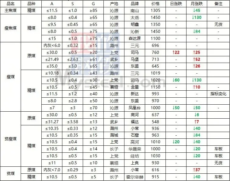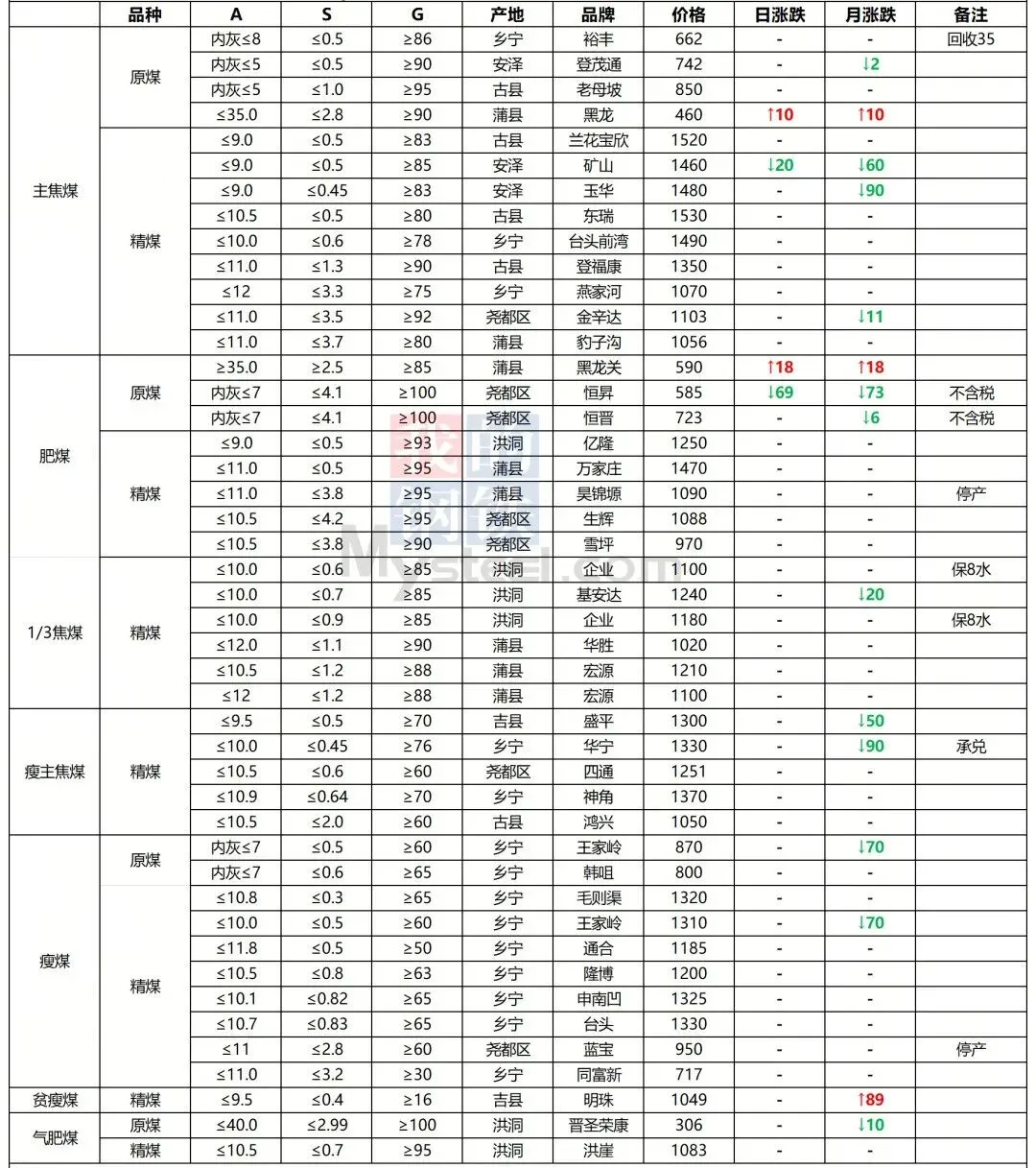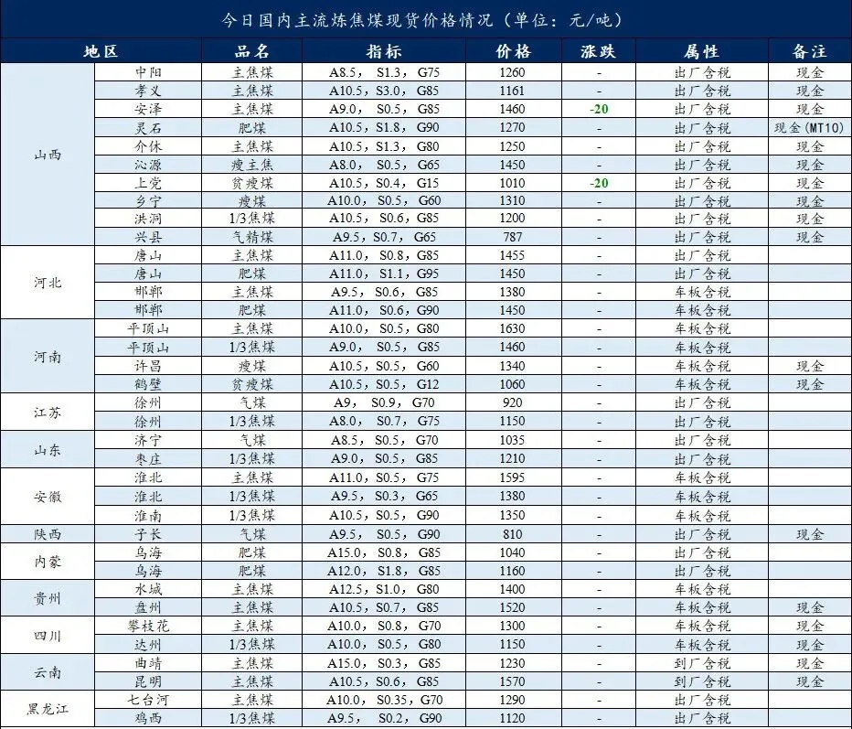 2026年3月8日前后,国内煤炭市场呈现全线下跌态势,多数煤矿单日多次下调价格,市场承压明显。临汾安泽市场炼焦煤价格下跌20元/吨,低硫主焦精煤A9、S0.5、V20、G85出厂价现金含税1460元/吨。