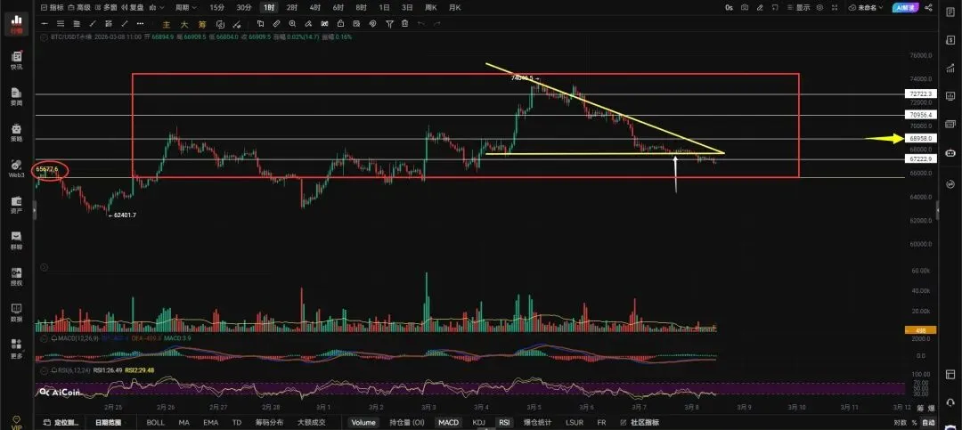 这个周末还行至少大饼还有点波动没走直线运动就挺好了,但是也没有继续扩大跌幅,看来还没到川普搞事的时间。大饼小时级别三角形被跌破,当下三角形下边界就是大饼的阻力位,能重新回到三角形内部运行才能阻止现在阴跌的走势,突破三角形68958才会走反弹,才有机会去摸7万整数关口和更高的位置。不能收回到67222和三角形内部运行就会去测试下方的65677的支撑,撑不住大红框圈出的这段多头走势就彻底终结。被迫你也要向下看再次回踩62400附近。