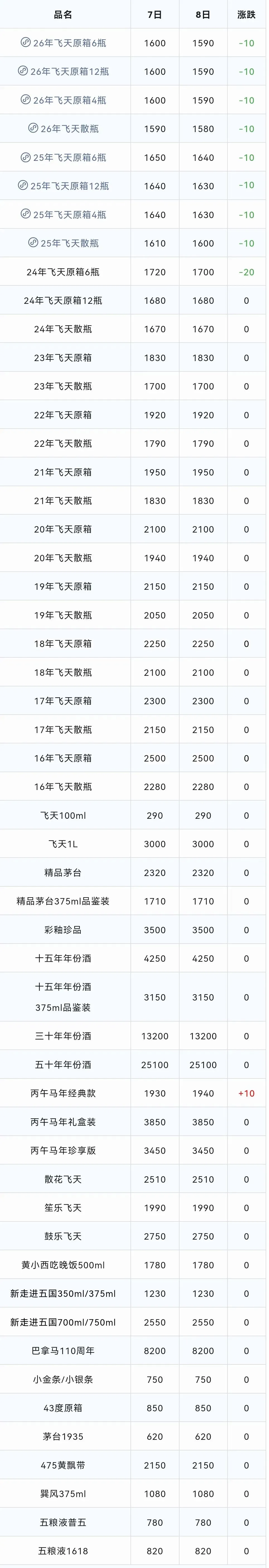 由于公众号平台修改了推送规则,如果不想错过“茅酒顾问”行情价,记得读完点一下“在看”,这样每次新文章推送才会第一时间出现在你的订阅列表里。今日(3月8日),从茅酒顾问发布的白酒价格行情监测数据显示,近段时间整箱茅台价格一直在1550徘徊,散瓶在1540左右,今日53度贵州飞天茅台(500ml)一批价跌至1590元左右!散飞在1580。