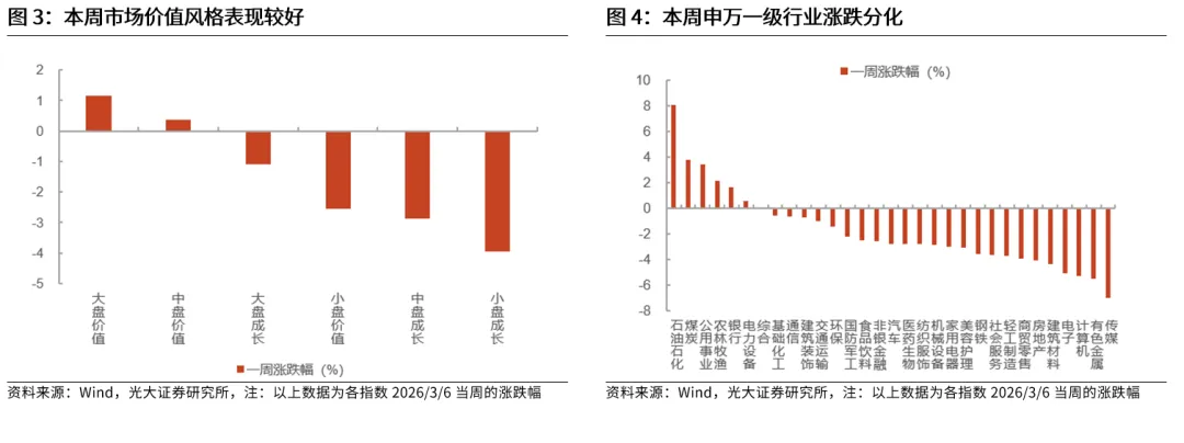 本周市场风格有所分化,价值风格表现相对更好。从市场风格指数表现来看,本周市场风格相对偏向价值。其中,大盘价值相对表现最靠前,涨跌幅为1.2%,而小盘成长相对表现最落后,涨跌幅为-3.9%。相对而言,本周市场风格更偏向价值,这或许与近期市场情绪回落,风险偏好下降有关。