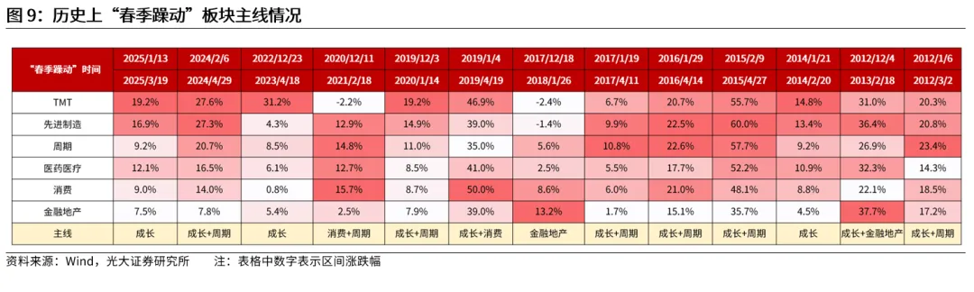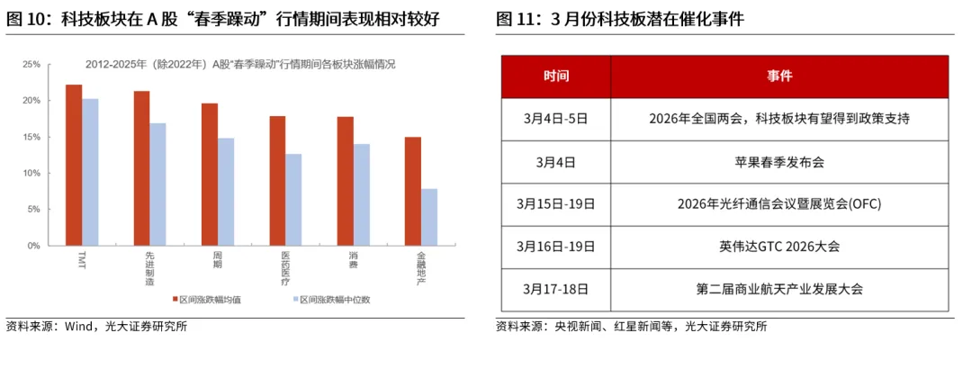科技板块值得重点关注。历史来看,“春季躁动”期间,TMT及先进制造板块的弹性相对更大,其在2012年至2025年(除2022年)A股“春季躁动”期间涨跌幅均值分别为22.2%、21.3%,明显高于其它板块的平均涨幅。而科技板块未来也存在较多潜在催化,如全国两会、苹果新品发布会、英伟达GTC大会等。具体方向上,可重点关注产业催化事件较多的AI产业链、人形机器人等。