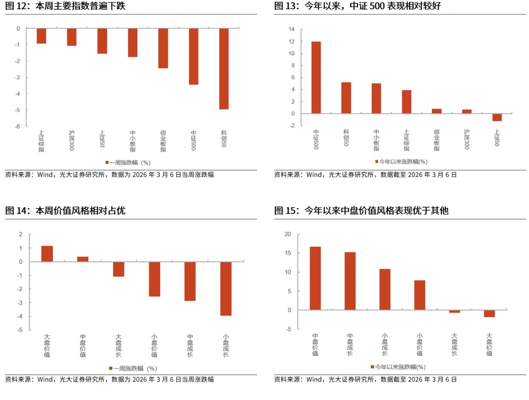 受市场风险偏好下降影响,本周A股市场出现回调。受市场情绪转弱、风险偏好下降影响,本周A股市场出现回调,主要宽基指数普遍下跌。在主要宽基指数中,上证综指表现最好,涨跌幅为-0.9%,而科创50表现最差,涨跌幅为-4.9%。目前万得全A估值处于2010年以来94.8%分位数。