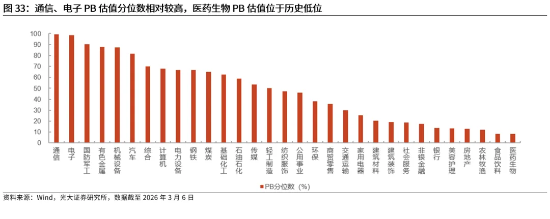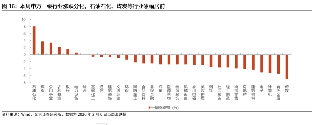 热点方面本周“涨价”主题内出现较为明显的分化。金属类如贵金属、工业金属、稀有金属等方向整体震荡加剧。反观能源石化、化学原料、农业等整体表现相对突出。我们认为由于当前地缘风险担忧尚未消退。同时随着能源转型和AI投资增加等趋势依然延续,这使得相关板块的叙事逻辑尚在。投资者短期可关注涨价线中整体涨幅有限,且估值相对较低的化学原料、农业等。中期需关注原油是否长时间在高位逗留,如此或会引发美元转强,造成各大类资产波动率放大的可能。