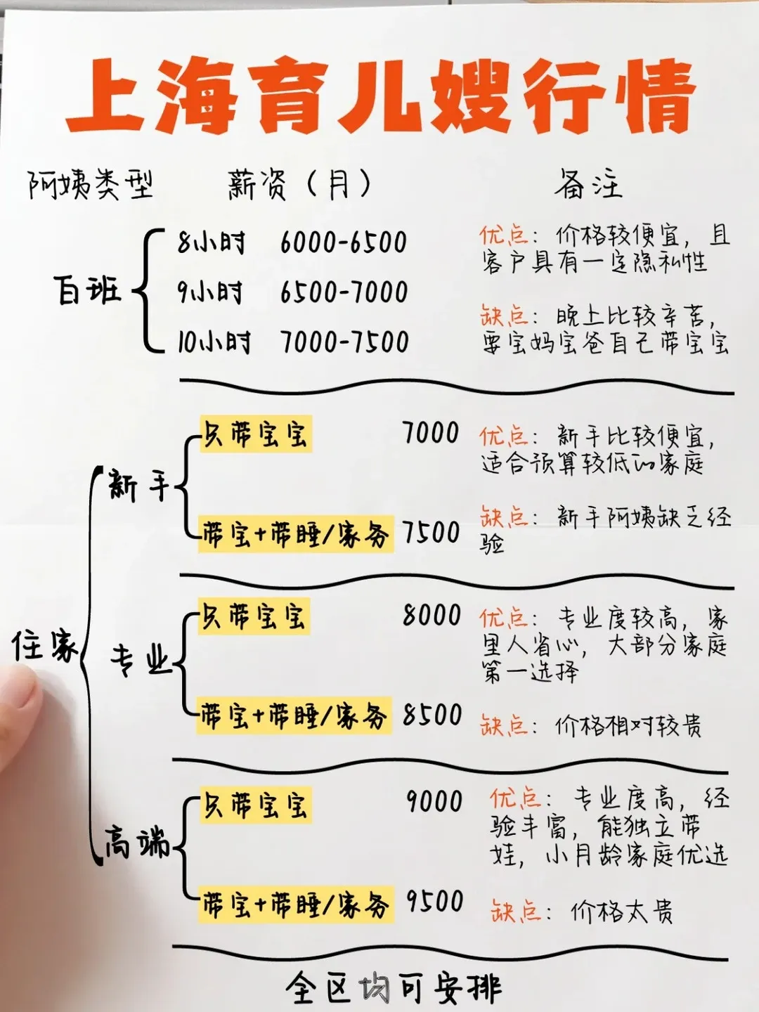👉上海育儿嫂多少钱一个月?上海白班育儿嫂➕住家育儿嫂行情,一篇讲清楚👇💰6000+育儿嫂,辅助带娃、营养辅食、陪护护理、早教、上门烧饭、做家务全部能搞定🙋超实用的上海育儿嫂服务,不同需求对应不同套餐,宝妈闭眼冲! ✅白班育儿嫂 🔹8小时💰6000-6500/月 🔹9小时💰6500-7000/月 🔹10小时💰7000-7500/月 优点:价格较便宜,且容户具有一定隐私性 缺点:晚上比较辛苦,要宝妈宝爸自己带宝宝 ✅住家育儿嫂(分为专带宝宝、带宝+带睡/辅助家务两种) 🔹新手💰7000-7500+/月 优点:新手比较便宜,适合预算较低的家庭 缺点:新手阿姨缺乏经验 🔹专业💰8000-8500+/月 优点:专业度较高,家里人省心,大部分家庭第一选择 缺点:价格相对较贵 🔹高端💰9000-9500+/月 优点:专业度高,经验丰富,能独立带娃,小月龄家庭优选 缺点:价格太贵 ✅饮食喂养(宝宝辅食添加、辅助母乳喂养及调配奶粉) ✅起居照顾(独立带睡、穿衣、洗脸刷牙、更换尿布、清洗臀部、洗澡) ✅日常照护(按揉、抚触、观察体温体重及大小便、宝宝常见症状防护) ✅早期教育(游戏互动、语言交流、婴幼儿智力及潜能开发、大动作训练、精细动作训练等) 💡根据这份上海当地育儿嫂家政市场价格表,找育儿嫂阿姨肯定不会吃亏‼️ ⚠️实际价格还要根据雇主的需求,阿姨的经验和级别,是否住家等多重因素决定