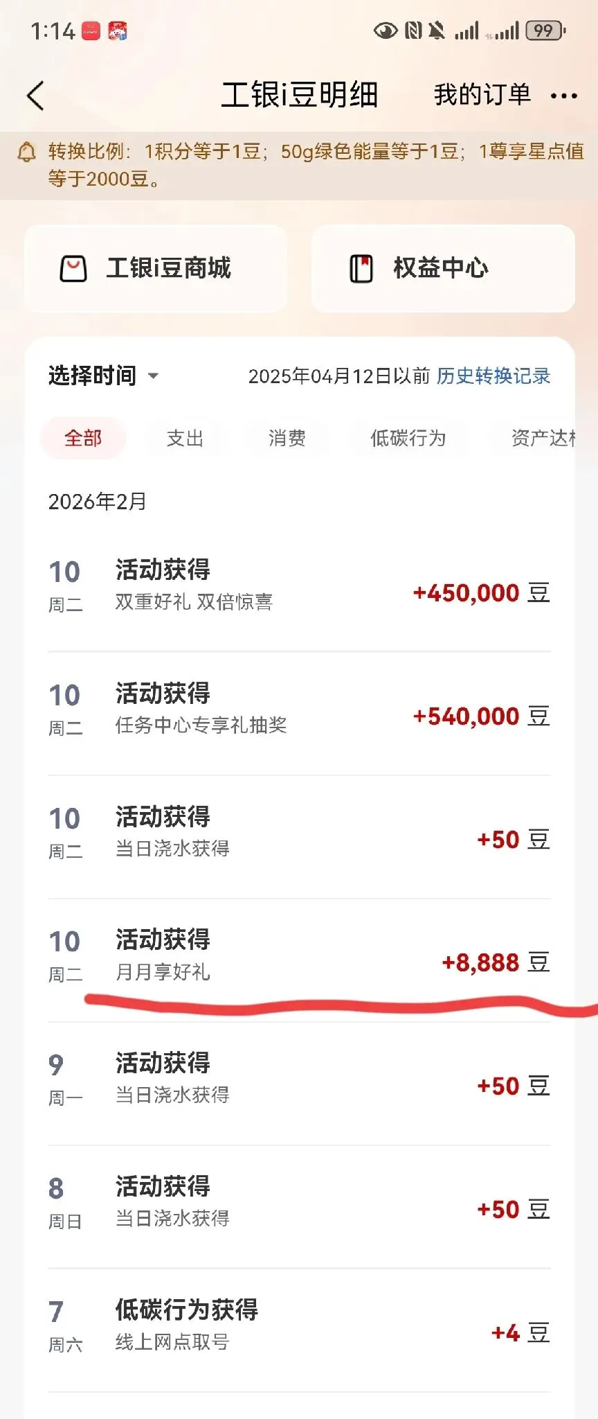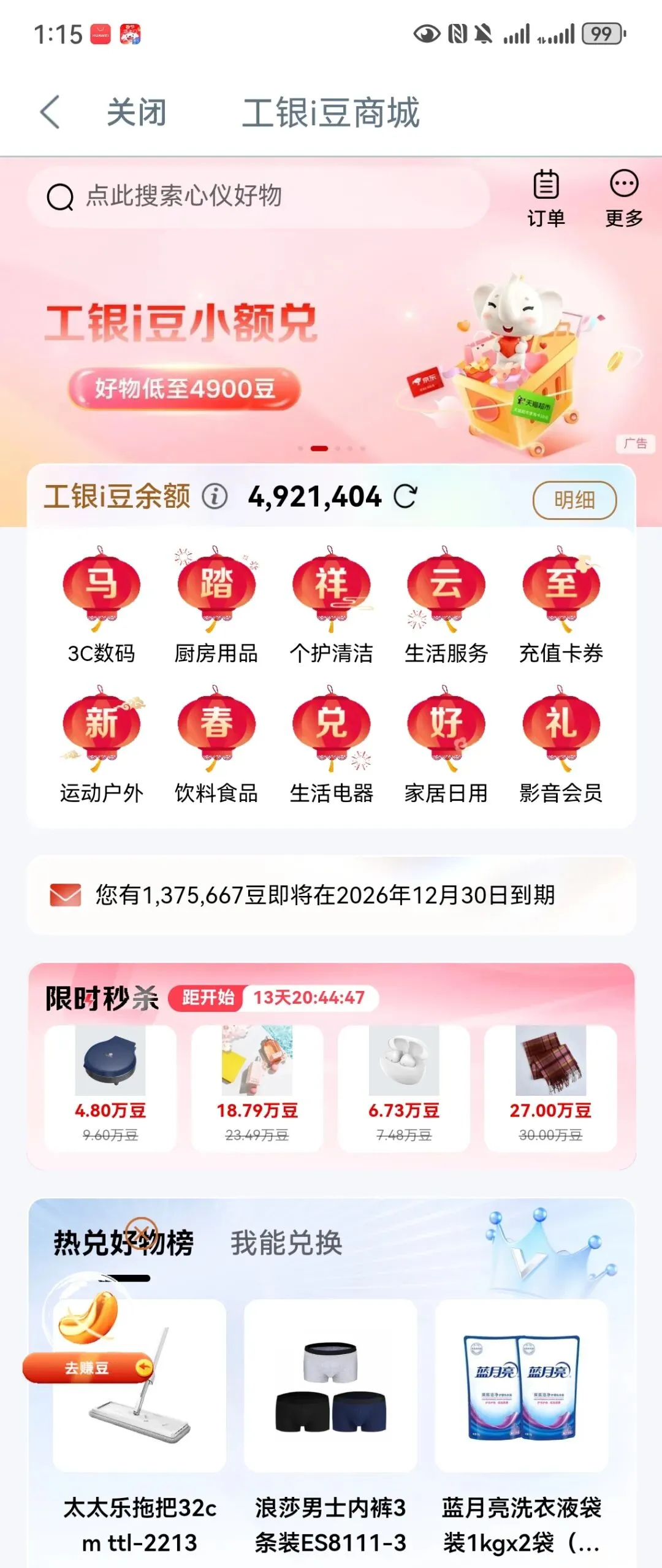 如果你有492万,你打算换点什么呢?哈哈,492万不是人民币,更不是美金,是492万的I豆,是工商银行给免费发放的工银I豆!我每天浇水,每周抽奖,每月10 号按时领奖,隔三差五做任务,一年下来,喜提将近500万[大笑][大笑]昨日家有喜事,亲朋欢聚我家,我忙得没时间上厕所,然而,我并没忘记领奖,华丽丽喜中100万!(8888+450000+540000+50)顿时,成就感爆棚!分享“新春升金礼”活动,2月11日到23日在工行日均资产达到1万元即可领奖,我果断报名,坐等3月5日开奖!拥有了500万,问题来了,我要换点什么?换什么最划算?欢迎朋友们给我支招!#工行i豆#